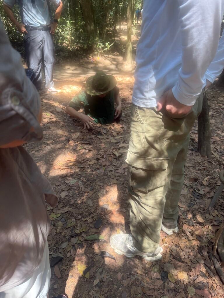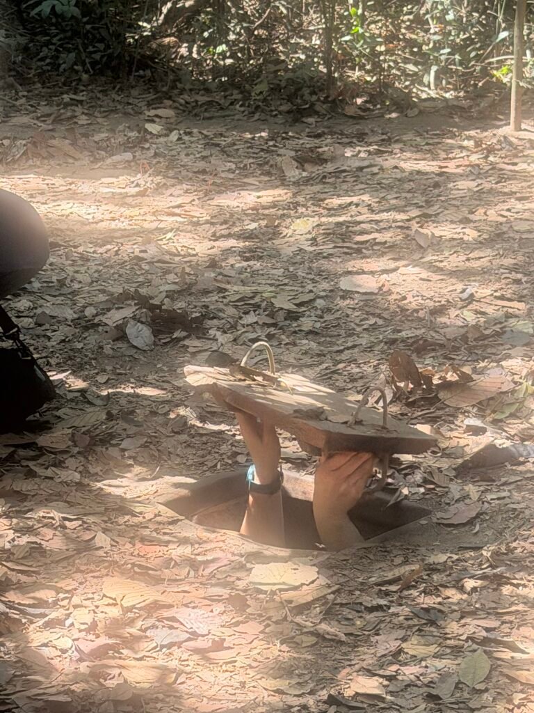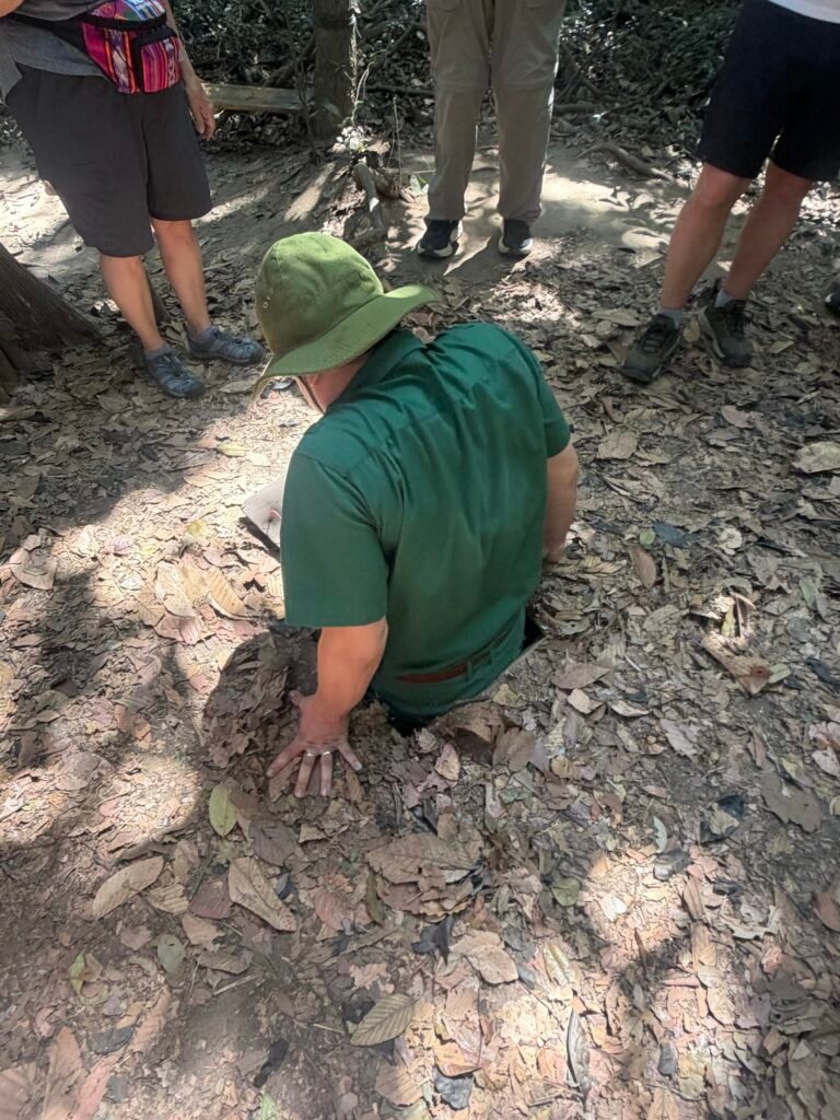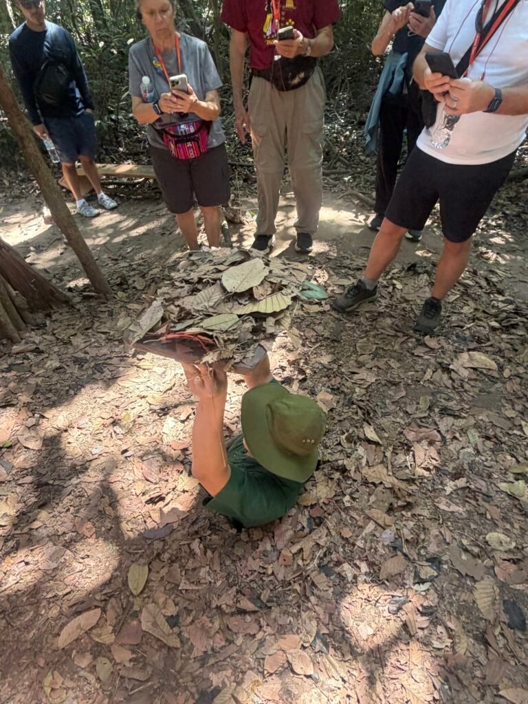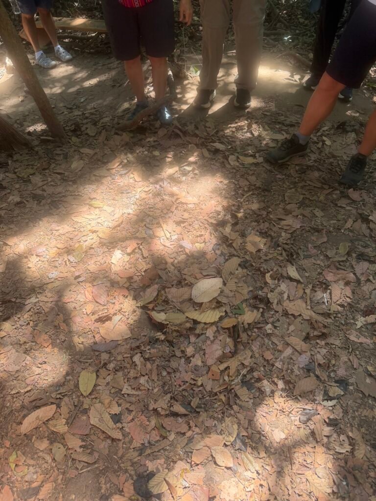 This morning after breakfast, we boarded our bus for the trek to see the Cu Chi Tunnels, a 125 mile long underground maze where thousands of fighters and villagers hid and fought during the Vietnam war. The South Vietnamese Communists, or Viet Cong, built this vast network of tunnels in and around the district of Cu Chi. The tunnels include mess halls, meeting rooms, small factories, and vast ammunition stores. The tunnels were used as a base for operations for the Tet offensive in 1968.