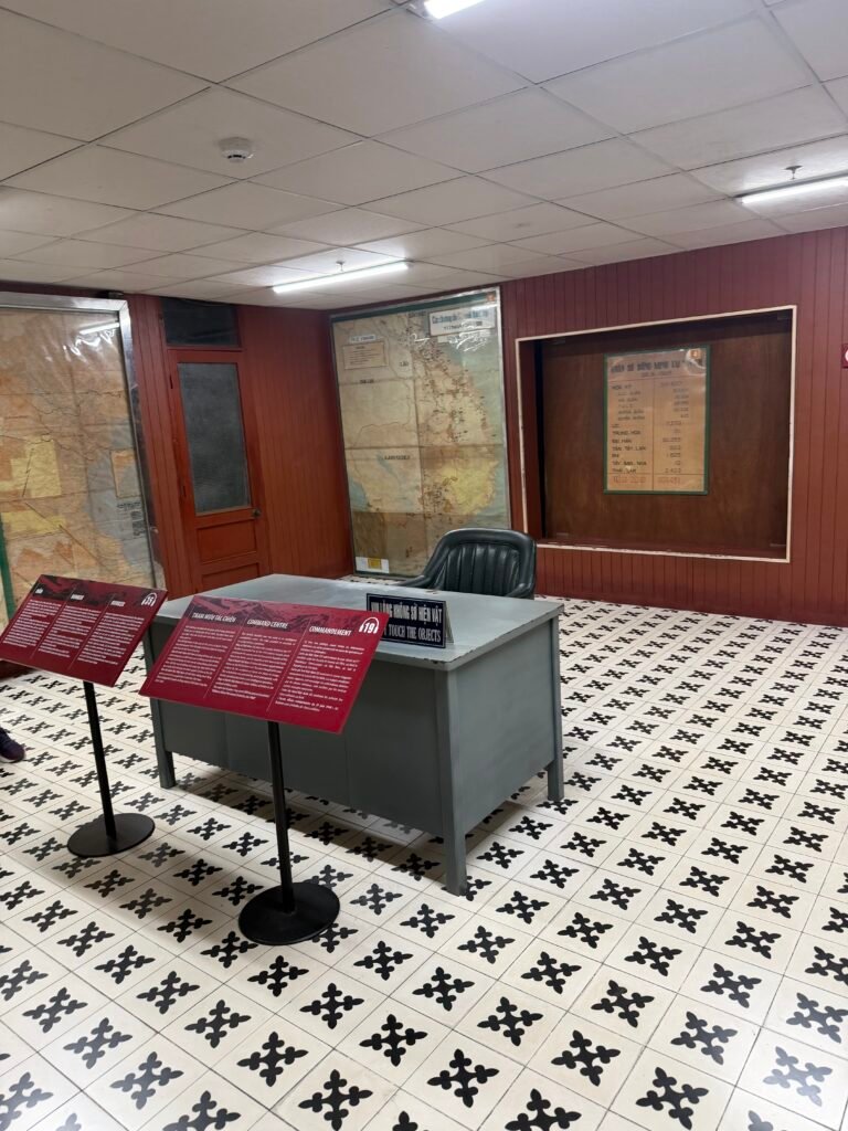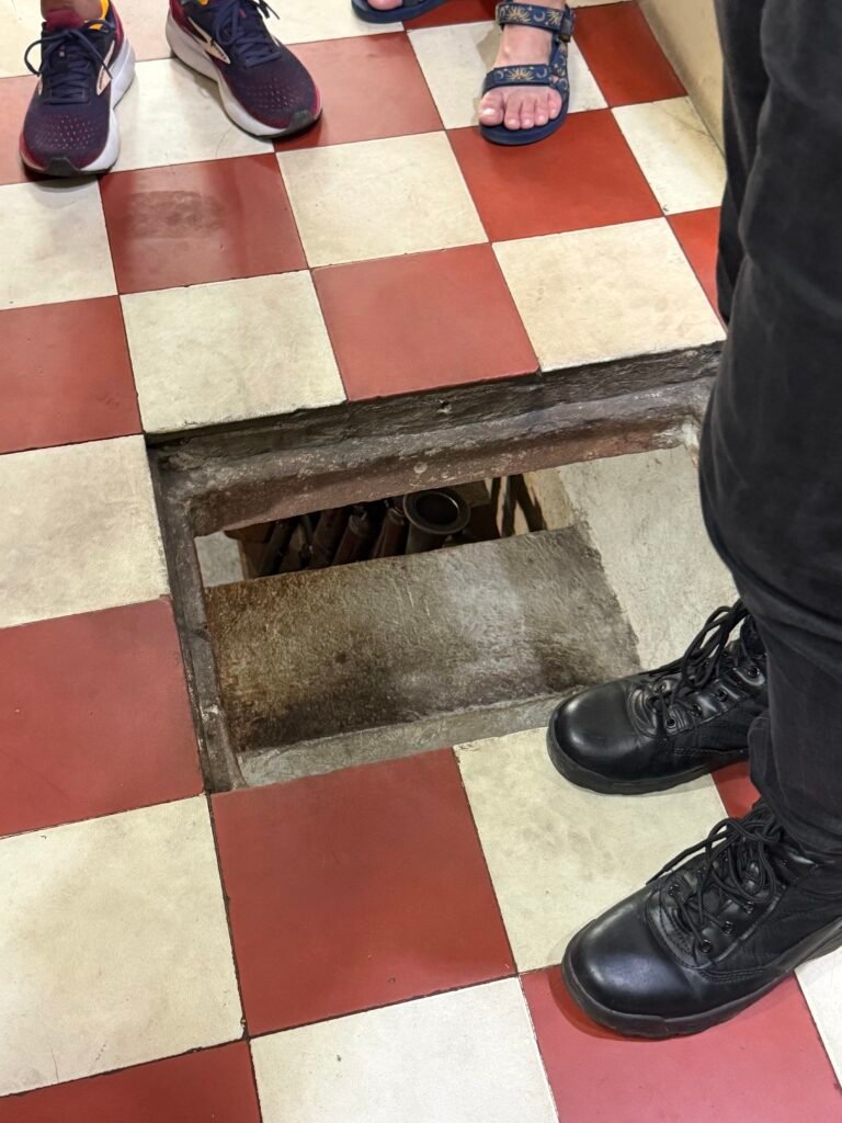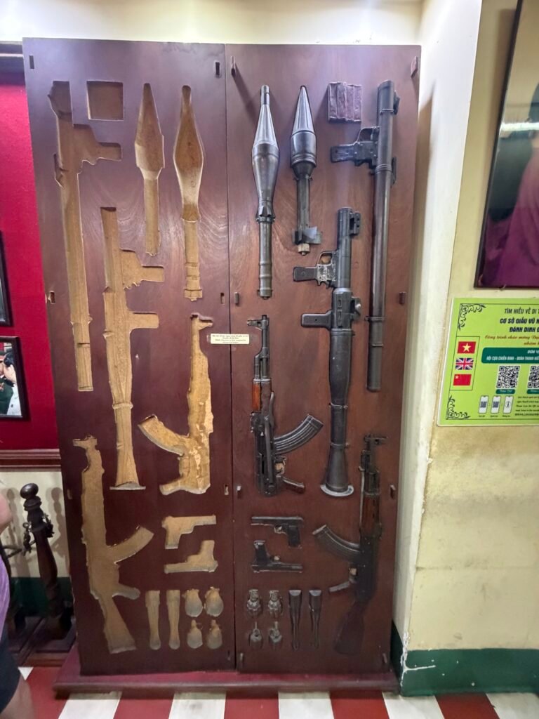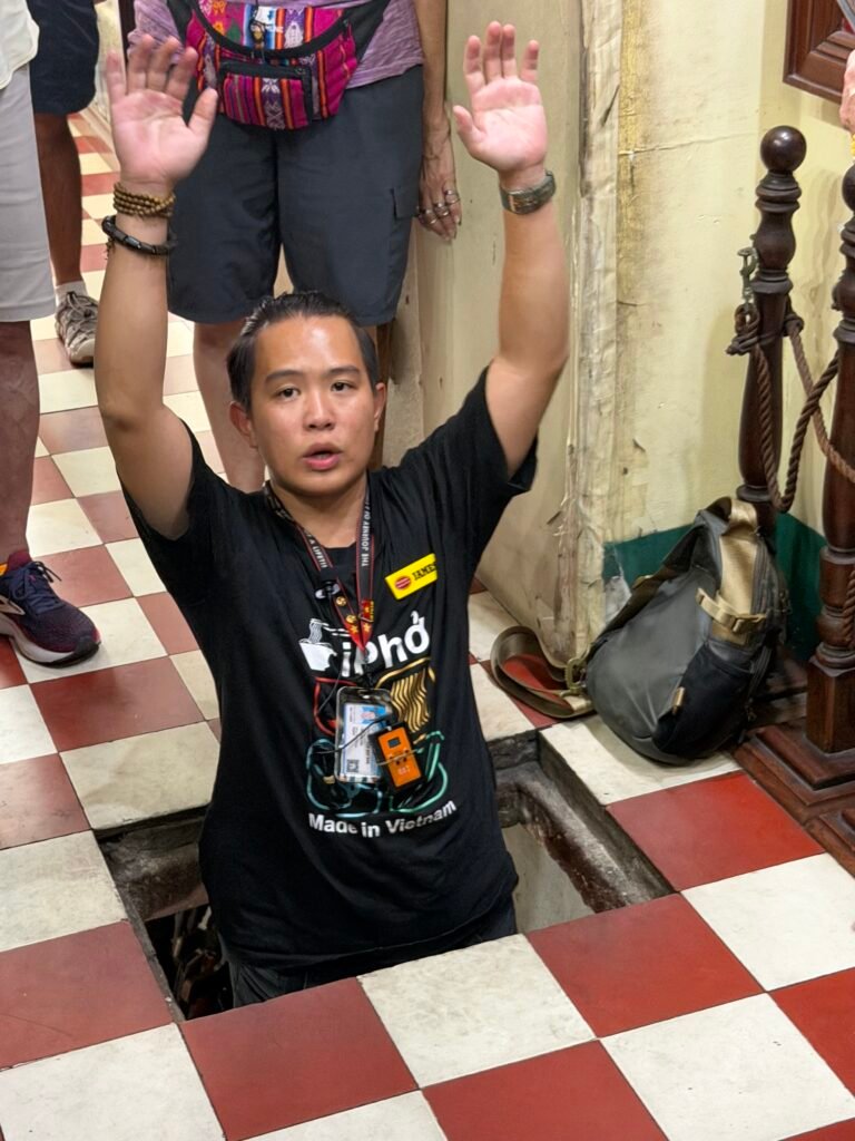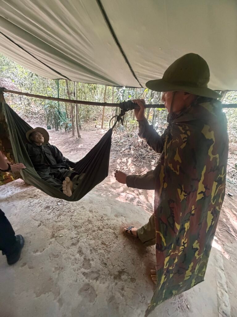 This morning after breakfast, we boarded our bus for the trek to see the Cu Chi Tunnels, a 125 mile long underground maze where thousands of fighters and villagers hid and fought during the Vietnam war. The South Vietnamese Communists, or Viet Cong, built this vast network of tunnels in and around the district of Cu Chi. The tunnels include mess halls, meeting rooms, small factories, and vast ammunition stores. The tunnels were used as a base for operations for the Tet offensive in 1968.