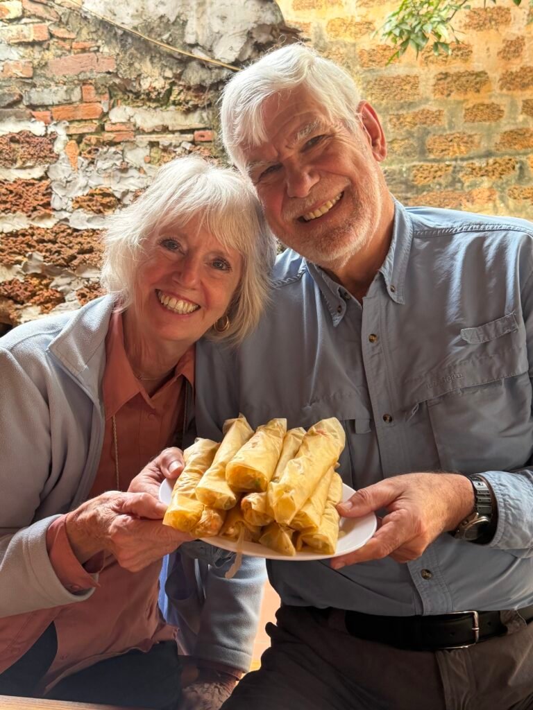 We enjoyed helping to make part of our lunch…spring rolls. I have made spring rolls before so I was pretty adept at rolling them. After we made the rolls, we sat down to eat them after they had been deep fried. Many other dishes were also served. We especially enjoyed Che Lam a Vietnamese nutty ginger sticky rice bar. Everything was delicious. I must say…we haven’t had a bad meal since we began this trip in Thailand weeks ago. All the dishes have been amazing!