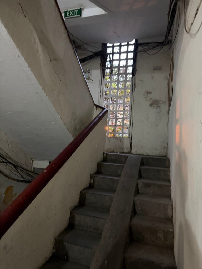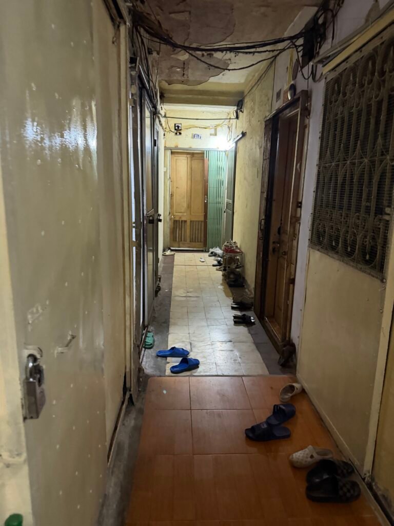 The kitchen and bath across from the man’s apartment. He owns the apartment and the kitchen and bath are for his use only. Everyone else on the floor shares two other kitchen/baths.