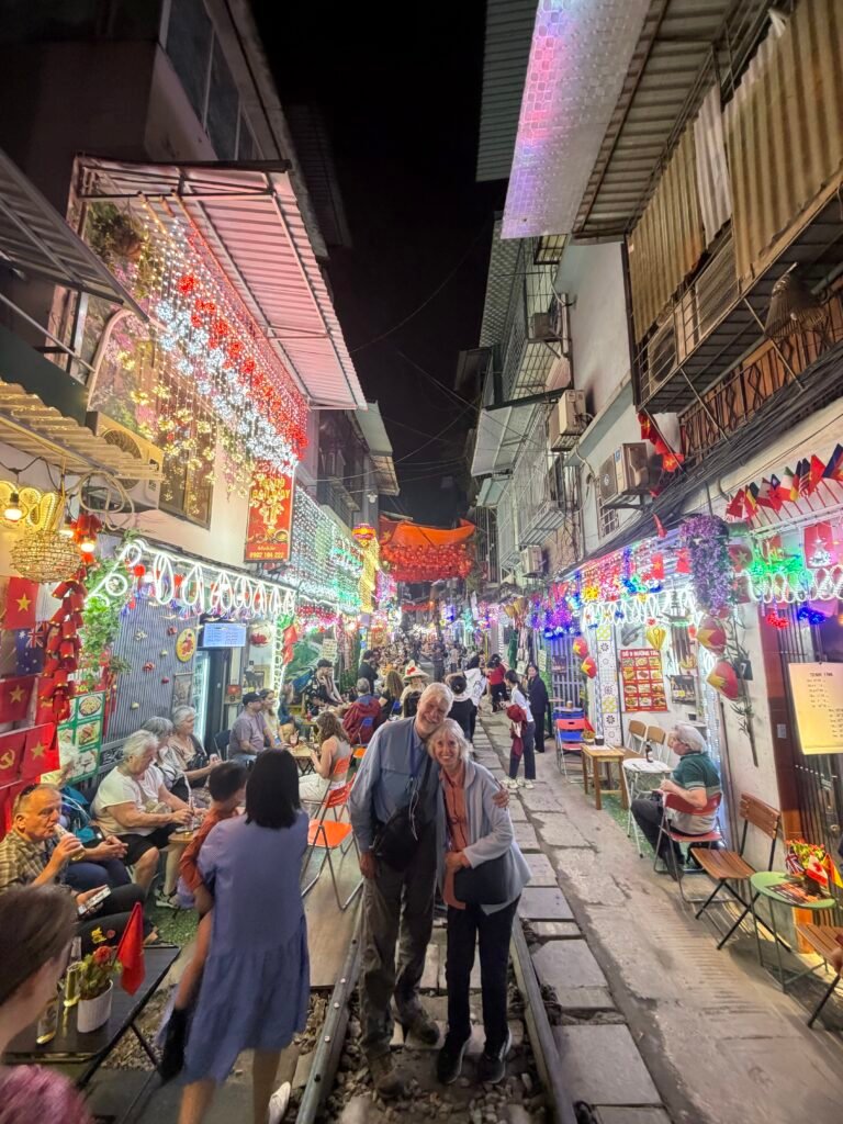 Located in the heart of the city’s Old Quarter, the Train Street attracts thousands of visitors each year. We were offered a drink…most of us chose beer, and we imbibed while waiting for the train to come by. As the time for the train to pass was imminent, we were told to keep our knees sideways, not to stand, and just remain seated. They put our beer caps on the tracks and then we sat and waited. After awhile, we were told the train was approaching and we had our cameras ready. OMG! What a thrill. The train passed literally inches from us and none of us expected it to be so close. It was scary, but a really fun experience! We searched for our beer caps and we found one of the Tiger ones, the brand we had been drinking, and we kept it as a souvenir.