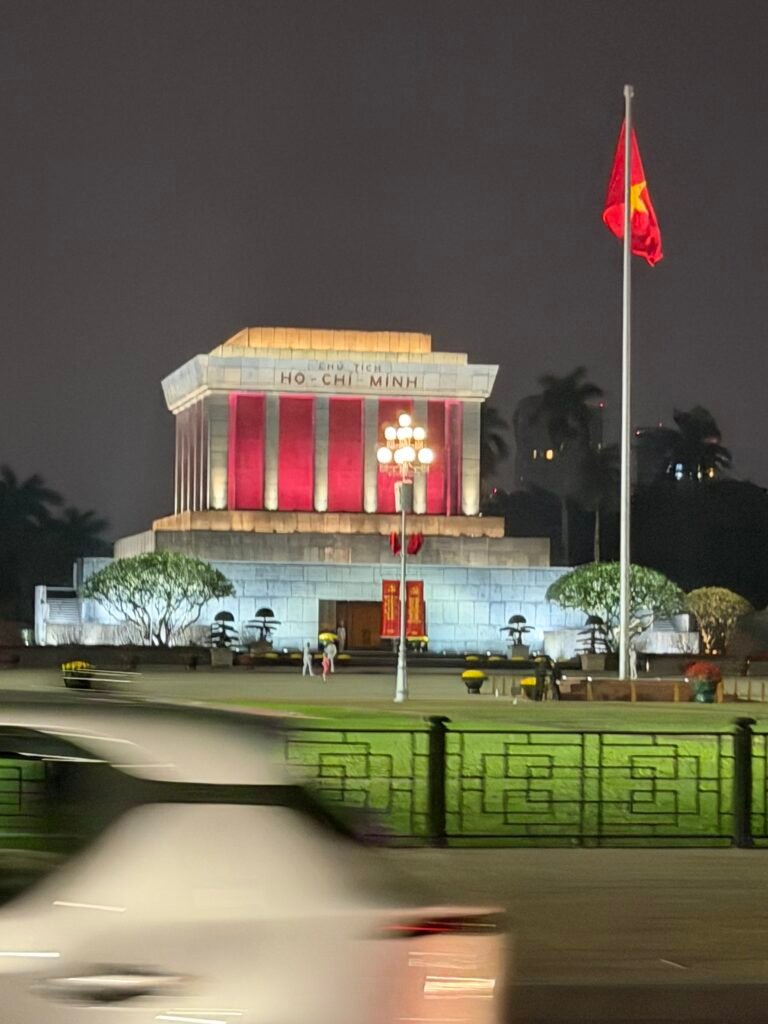 The Ho Chi Minh mausoleum at night.