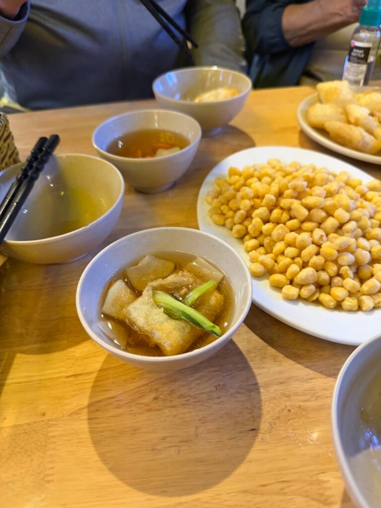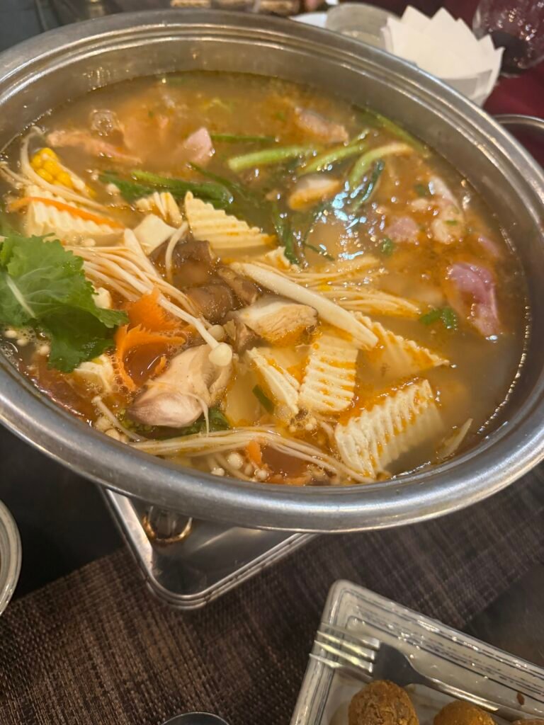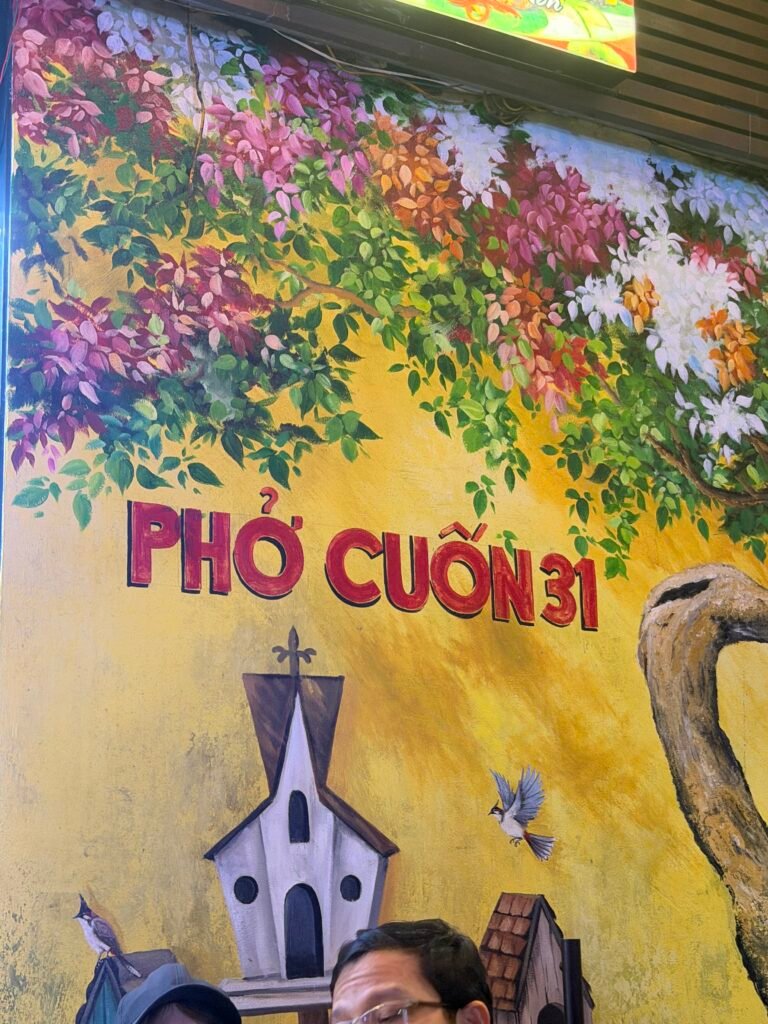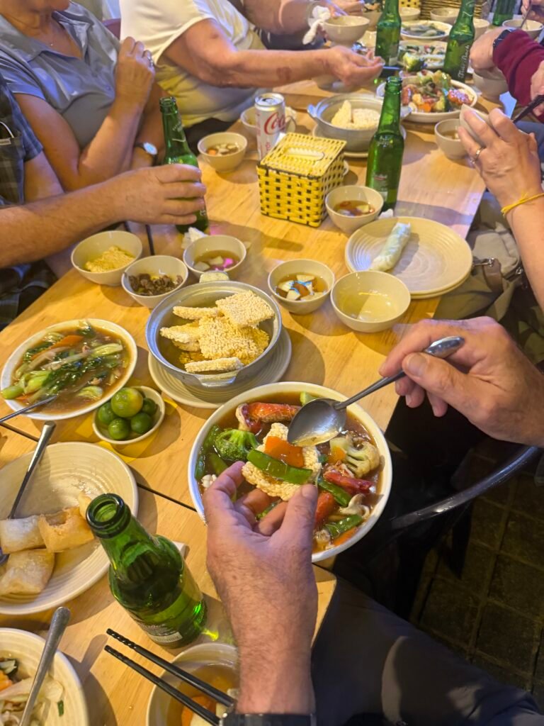 Delicious food. Some of the dishes were Cơm Cháy Hải Sản, spring rolls, fried corn, Nước Chấm (a dipping sauce), deep fried Pho noodles that are like little pillows and you fill them with stir fried beef and veggies and soak them in the dipping sauce. Everything was delicious. There were a lot more dishes served that I don’t know the names of. The pho pillows are on the left of the photo.
