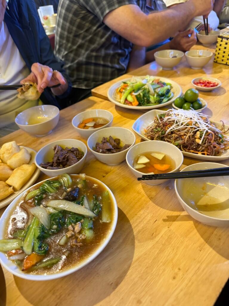Then we had dinner at a local restaurant, eating outside like all the locals. Nam showed us how to open the small pillow shaped pho noodles (not sure what they were made of) with our chop sticks and fill them with some of the meat and vegetables on the table. Then you soaked the filled square in a sweet/sour sauce and popped it in your mouth. Really tasty. All the food was stellar and we enjoyed every morsel.