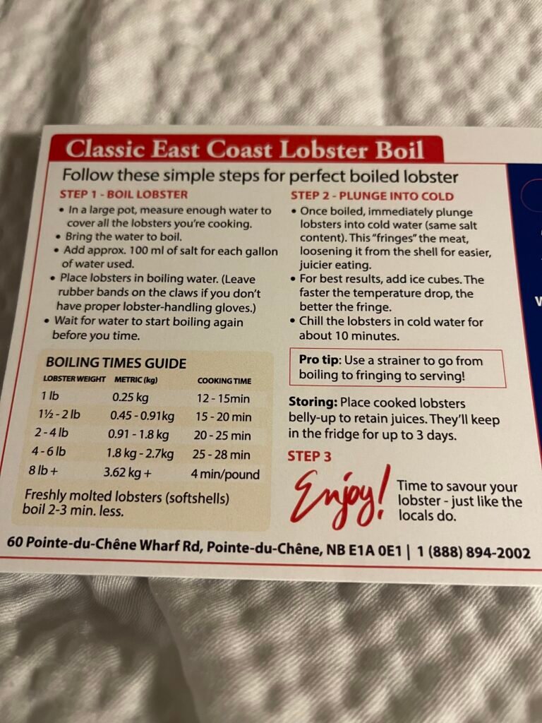 The best way to cook a lobster is to boil water and put about a 1/2 cup of salt in for each gallon of water. Place the lobster in the water and boil for the number of minutes per pound that is recommended. (See the photo below). Once the lobster is boiled, plunge it into cold water with the same salt content. This loosens the meat from the shell to make it easier to eat.