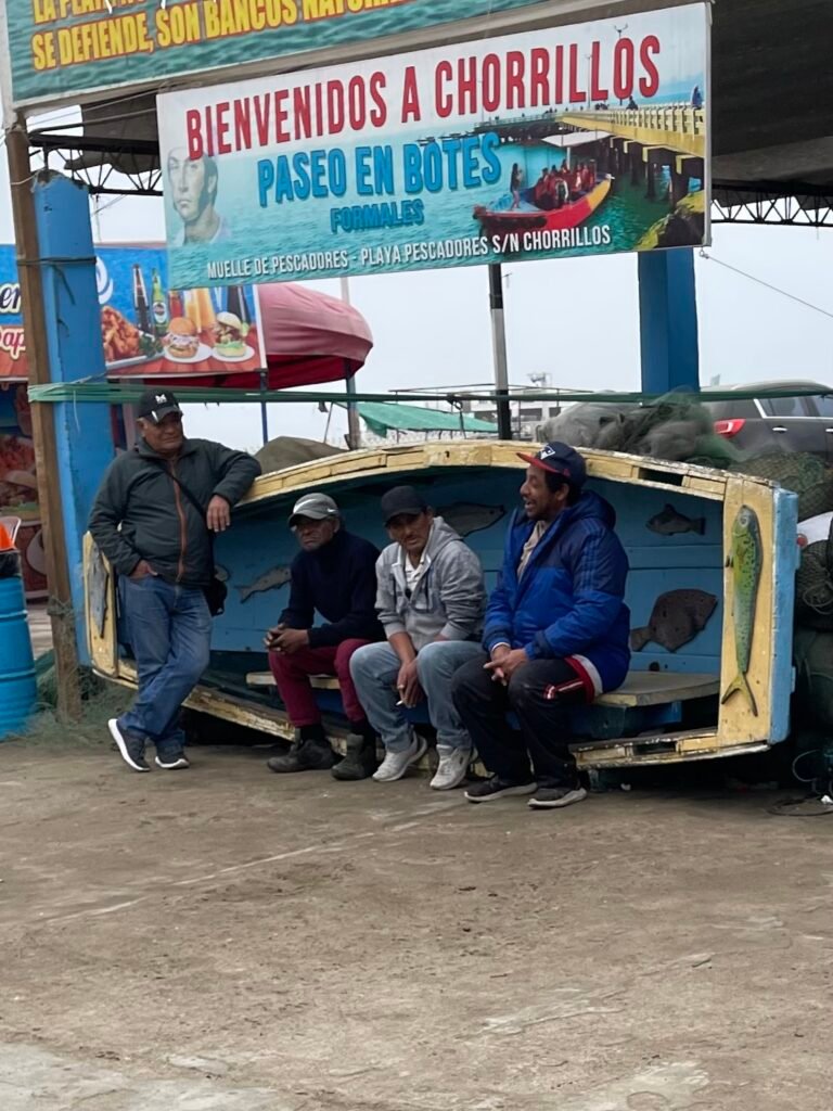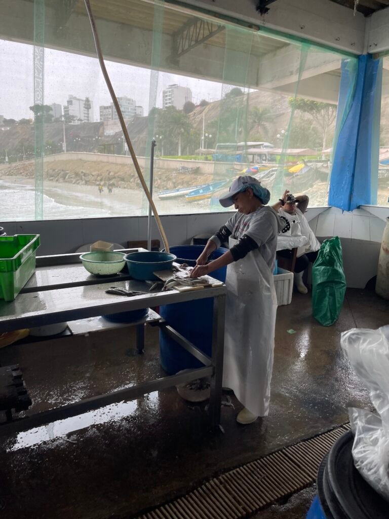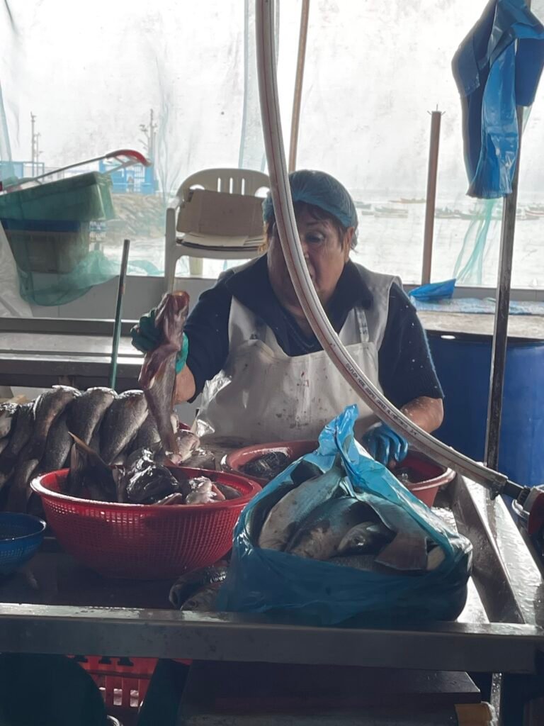 We then boarded a bus to visit the Chorrillos fish market, where we met our guide Sandra who took us all through the market. We watched as the ladies scaled, gutted, and readied the fish to be sent to restaurants. The one lady has worked in the market for many years and she makes a very minimal wage. Her husband had passed away a few years ago, so this is how she gets money to buy food, etc. We walked over to speak to a fisherman who told us he fishes through the night and finishes about 6 in the morning. The fishermen were mending their nets to go out tonight. They fish everyday no matter the weather.